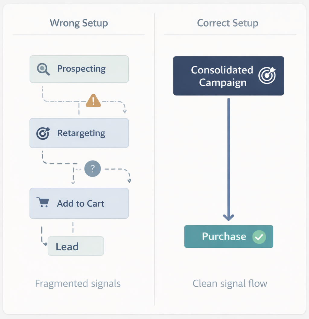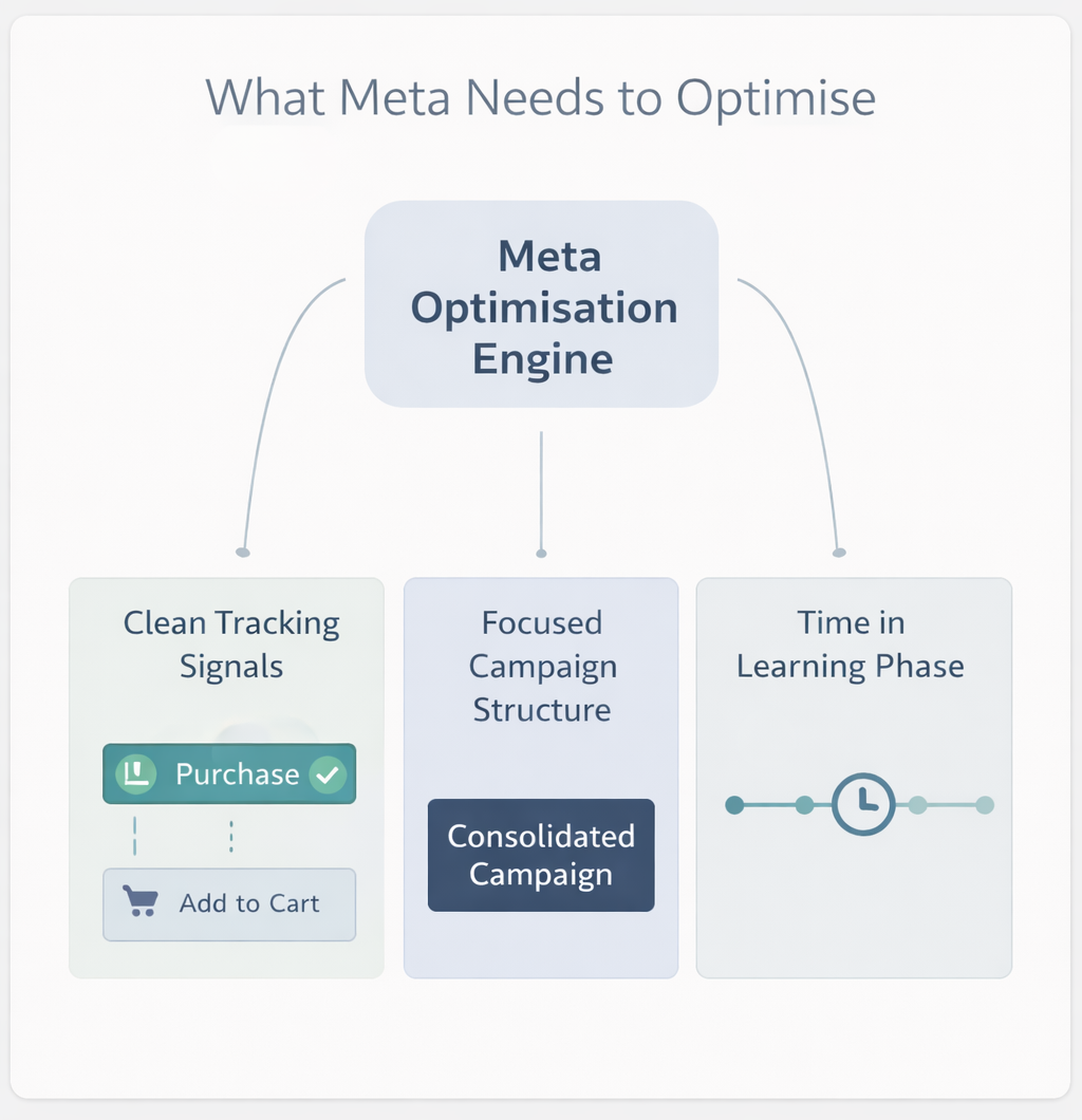 A single, focused campaign structure is built to support Meta’s current optimisation model, prioritising signal quality, consolidation, and learning stability.